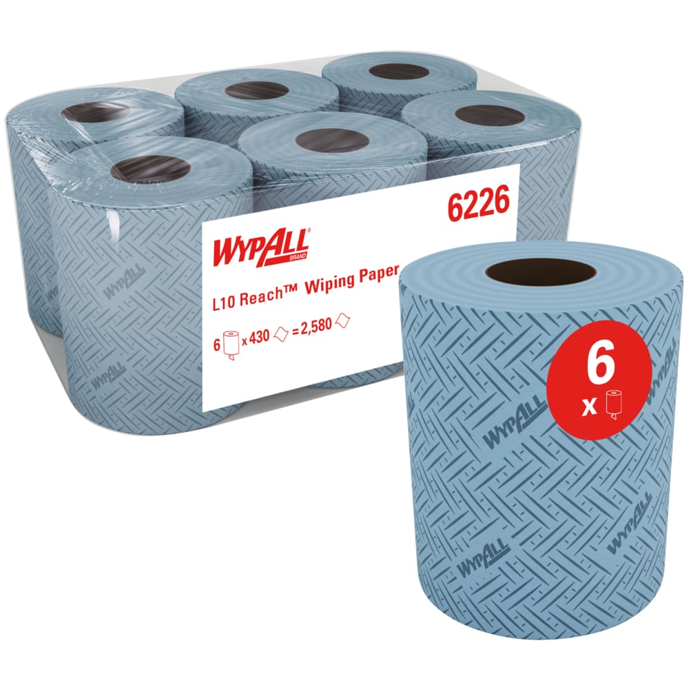 • Each blue roll of WypAll® L10 Reach™ wipers contains 430 brand embossed, 1 ply, disposable, dry cleaning wipes delivered in centrefeed rolls for easy single sheet dispensing